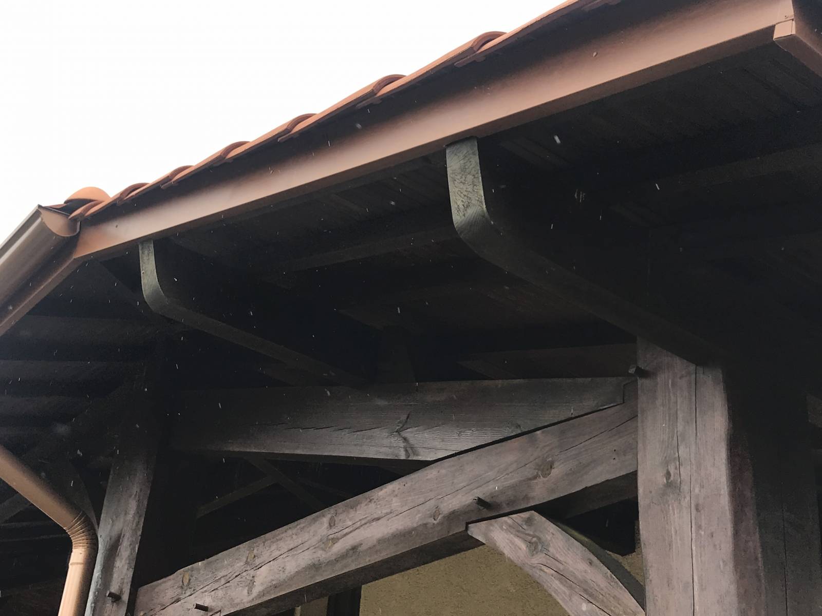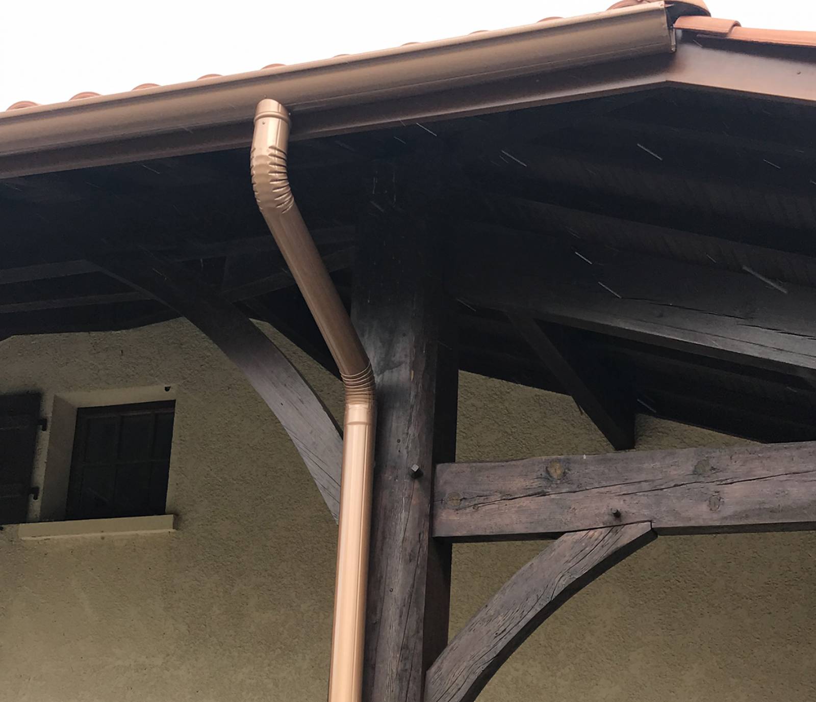Notre mission concerne cette fois, une maison de style landais, propre à la région et que l’on retrouve particulièrement aux alentours du Muret. Notre choix s’est donc porté sur un modèle de gouttières particulier : le San Marco SM33 avec des descentes demi-rondes 80° de couleur cuivre. Fabriquée en continu sur le chantier, elle s’adapte à votre maison et en épouse parfaitement le moindre recoin pour un remplacement en bonne et due forme.